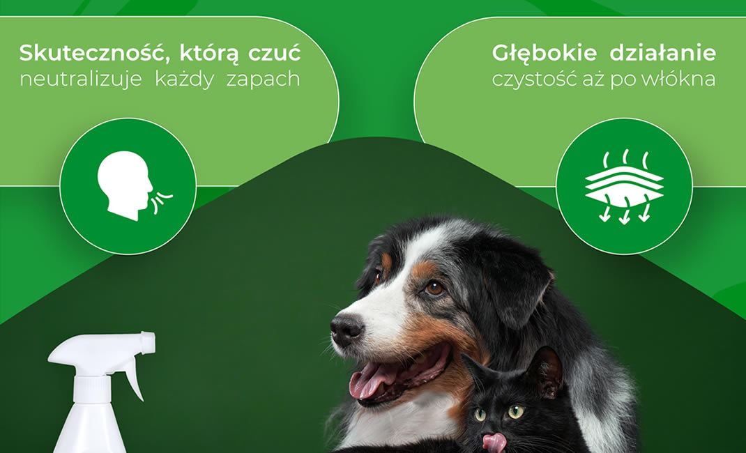 Nie maskuje zapachów, lecz całkowicie je usuwa, zapewniając długotrwałą świeżość w otoczeniu zwierząt.